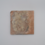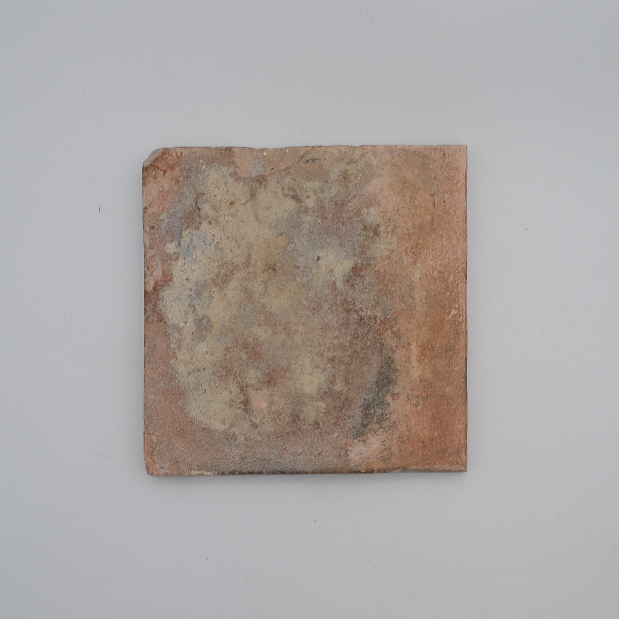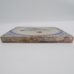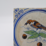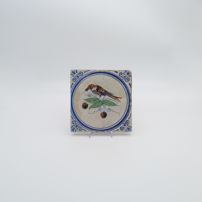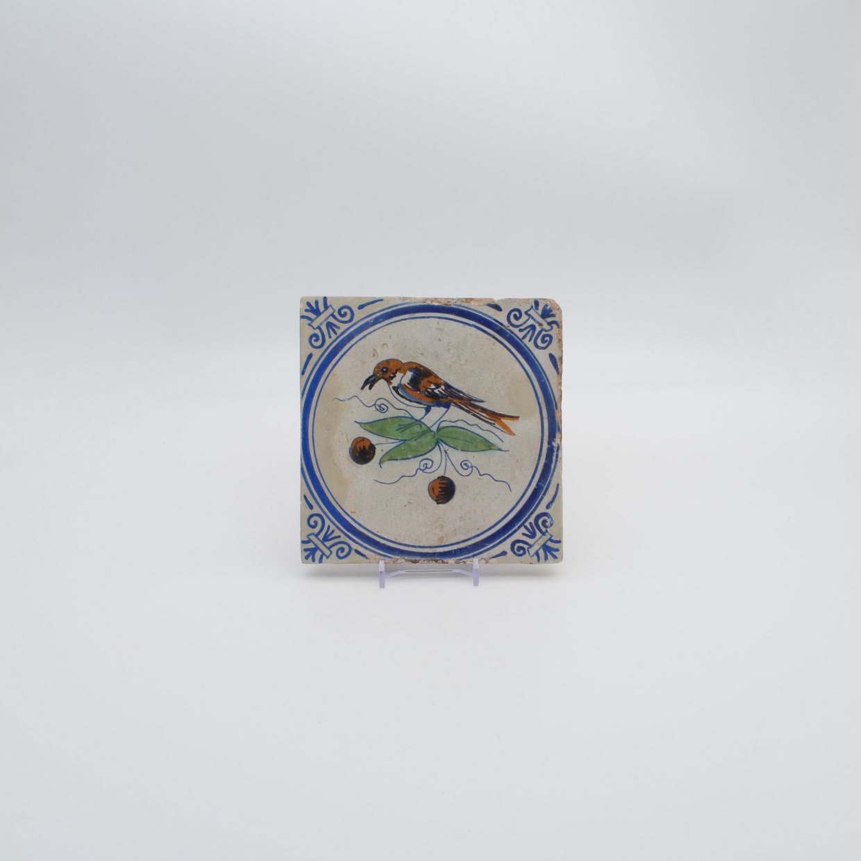 This early 17th-century tile depicts a delightful bird perched on a fruit-laden branch, likely bearing cherries, in vibrant shades of orange, green, and blue.