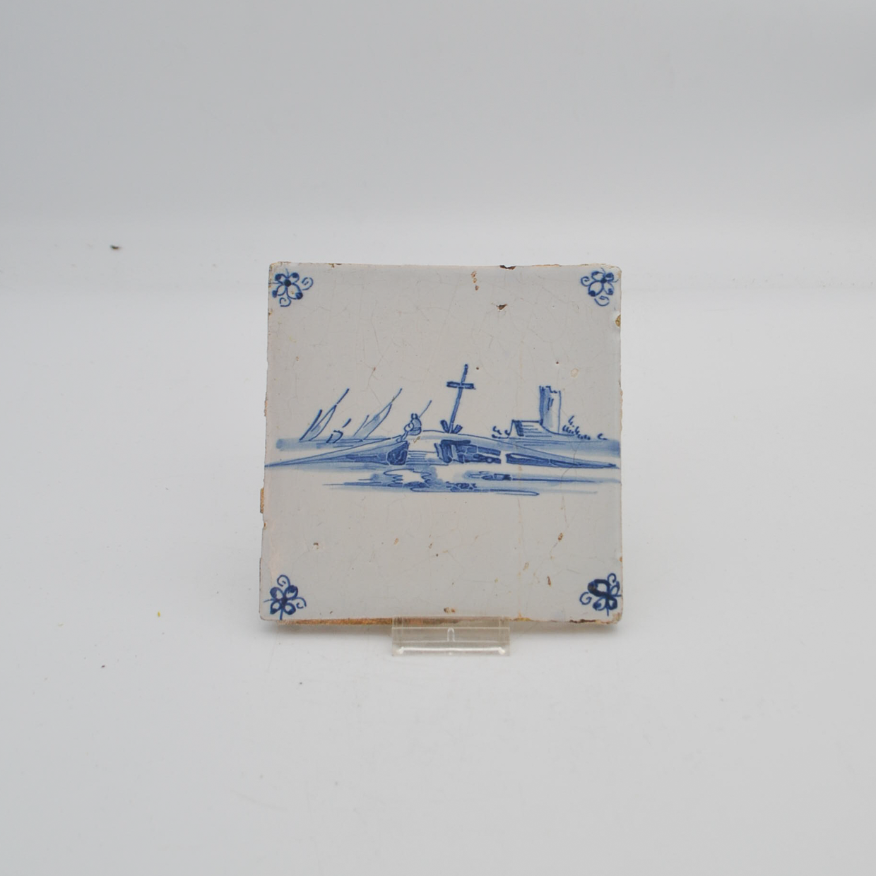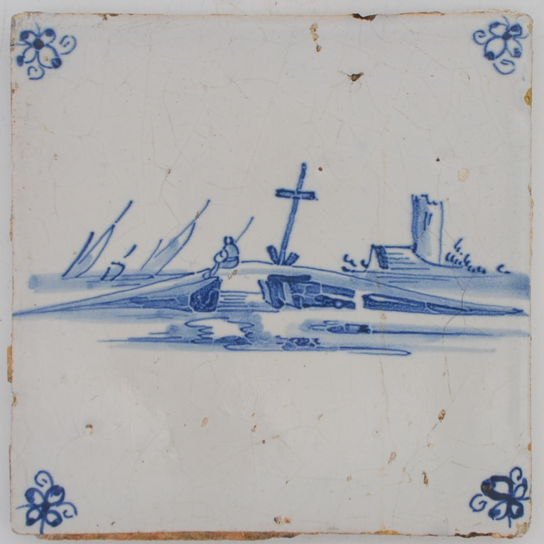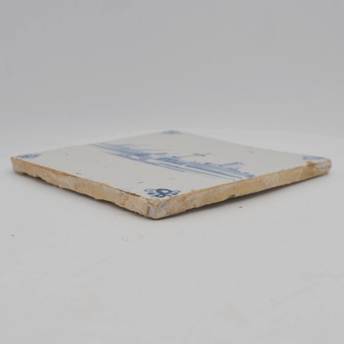 This Delft tile, dating back to the late 17th century, is part of a collection that was once part of an old house in Antwerp. It illustrates a bridge with boats and a village in the distance. What makes this tile stand out is the level of detail in its design. Compared to earlier models, the brush lines are finer, and the details are much more intricate.