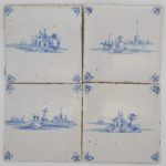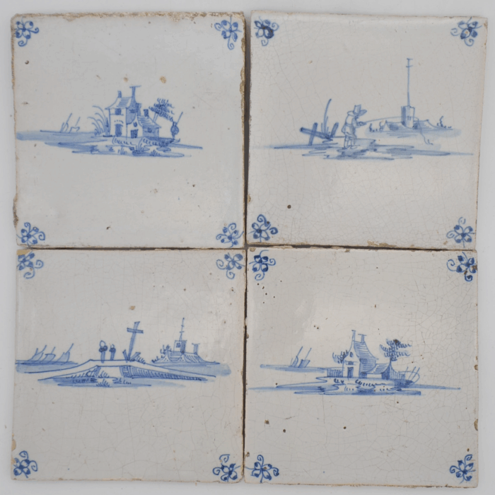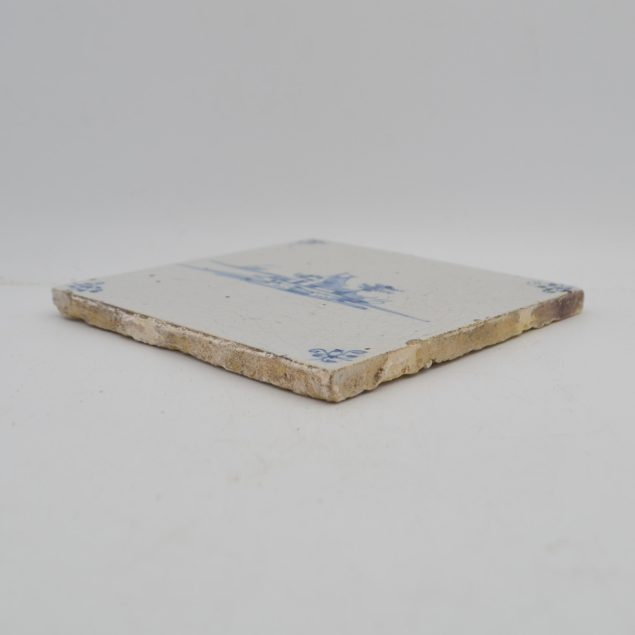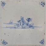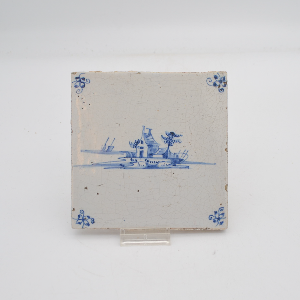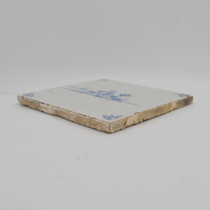 This Delft tile, dating back to the late 17th century, is part of a collection that was once part of an old house in Antwerp. It illustrates a Dutch farmhouse surrounded by water. What makes this tile stand out is the level of detail in its design. Compared to earlier models, the brush lines are finer, and the details are much more intricate.
