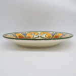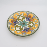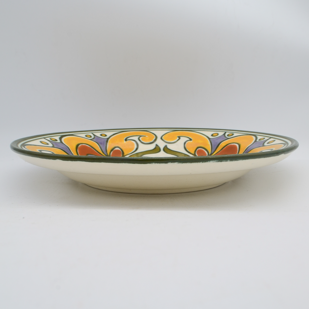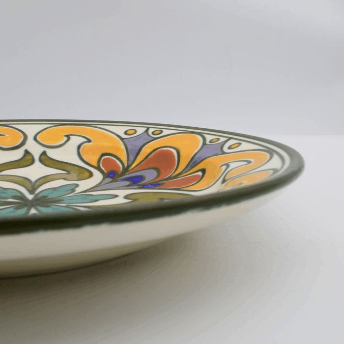 This ceramic plate was produced in the 1950s by Plateelbakkerij Zuid-Holland, a renowned pottery factory located in Gouda, the Netherlands. The design is named “Rigi Royal”, a hand-painted decorative pattern featuring stylised floral and abstract elements in bold colours such as ochre yellow, olive green, teal, purple, and deep red.