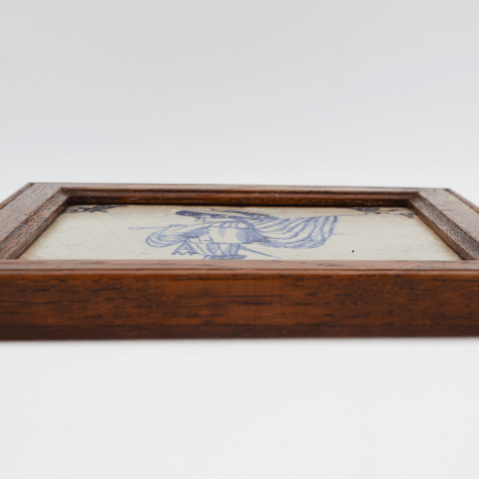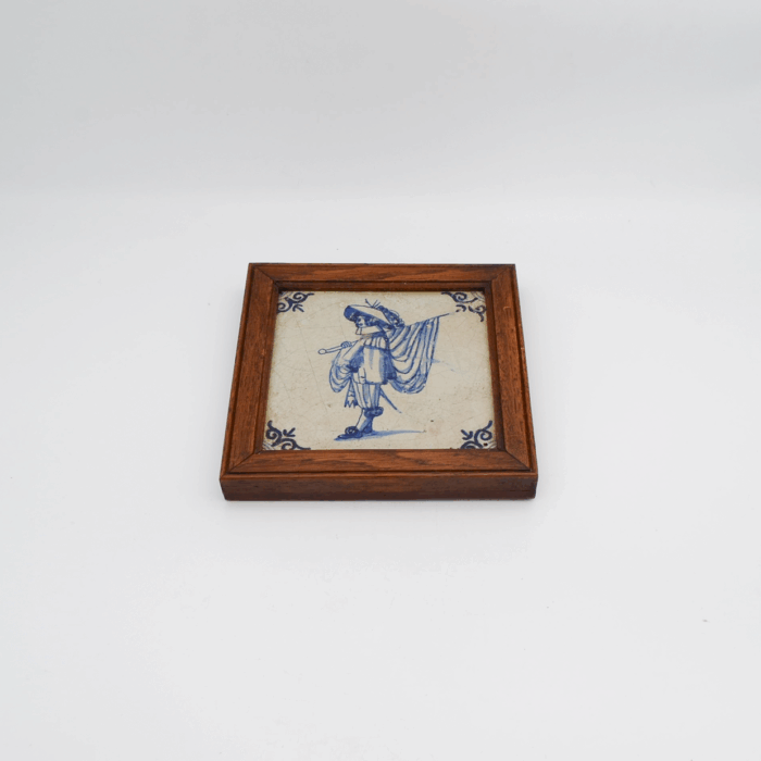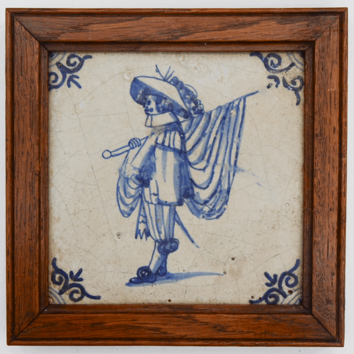This antique Delft tile features a depiction of a 17th-century standard-bearer (vaandrig), a figure of great significance in the Dutch army of the time. The standard-bearer was entrusted with the vital task of carrying the company’s flag—a symbol of honour, unity, and identity—making them a central figure on the battlefield.