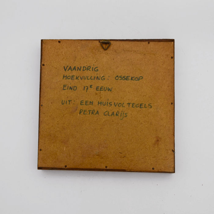 Hand-painted in traditional cobalt blue on white tin glaze with the classic ‘ox head’ motif, this tile beautifully captures the historical essence and artistic finesse of Delftware. It serves as a tribute to the bravery and symbolism embodied by the standard-bearer.